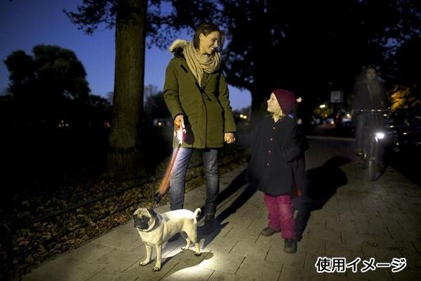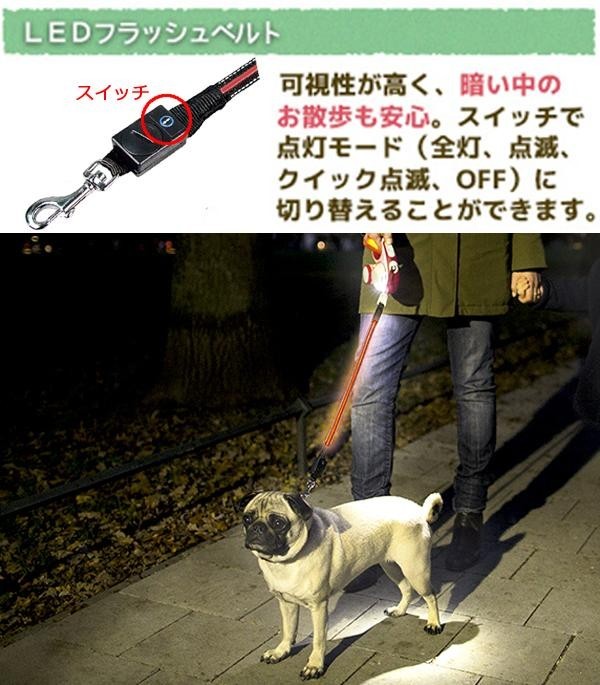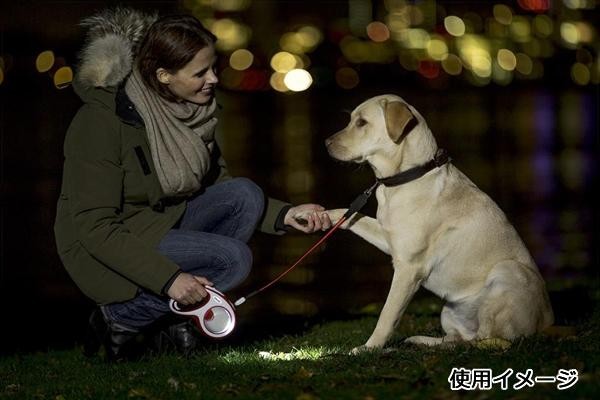 | 赤色に光って夜の散歩も目立つリード(ベルト)です♪ |
