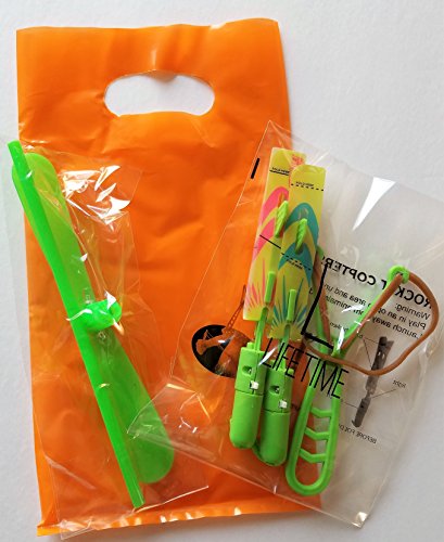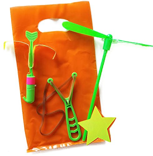 -. Feature : What kid wouldn't love getting this favor! Kid and parent approved. Prefilled to make life easier but without the usual favors or junk. You'll be known for these cool goody bags! / 6 prefilled favors come in each order. No work for you! Only favors that both boys and girls will love. / An orange bag with handle is filled with 2 (red and blue) rockets copters (same as the popular ones on TV), one launcher, one green LED Spinner, and one glow in the dark star sticker.. / Copters launch like a rocket and flies like a helicopter. Each one has an LED light for night time or glow in the dark fun. Can launch up to 120 feet in the air. (Light can stop working if it hits the ground hard.) / Boys and girls, adults and teens will all enjoy these favors. Perfect for birthday parties, boy/girl scouts, rewards, P.R.Izes, or fun activity.