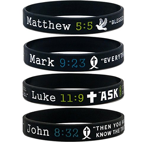 Pack of 12 "New Testament" silicone wristbands with Bible verses from the Four Gospels; Includes 4 unique designs. Standard adult unisex size of 8" around fits most men, women, & teens.