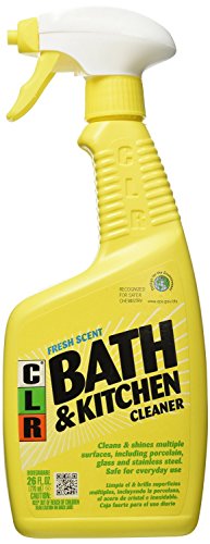 r Bath And Kitchen Cleaner, 26 Ounce Trigger Spray Bottles CLR Bath and Kitchen Cleaner removes hard water buildup, calcium deposits, lime, and dirt from kitchen and bathroom surfaces without scrubbing or using several different products. This versatile, multi-surface cleaner foams to remove even the toughest buildup from sinks, faucets, showerheads, and bathtub surrounds. Made in the USA with quality ingredients, it is certified by the Environmental Protection Agency (EPA's) Design for Environment. CLR is easy to use and cleans in just two steps, effectively removing stains while saving time. Just spray the solution onto the sink, shower door, or faucet, and wipe clean. CLR cleans the two dirtiest rooms in your home with less effort.