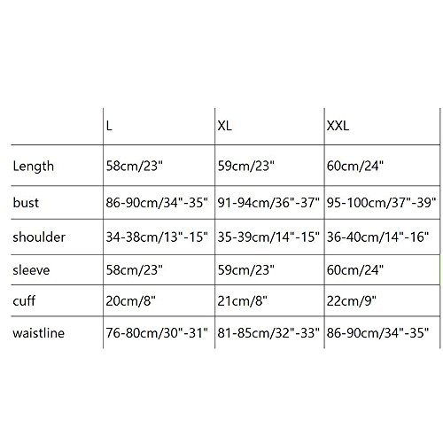 L-Length:58cm/23",bust:86-90cm/34"-35",shoulder:34-38cm/13"-15",sleeve:58cm/23",cuff:20cm/8",waistline:76-80cm/30"-31" XL-Length:59cm/23",bust:91-94cm/36"-37",shoulder:35-39cm/14"-15",sleeve:59cm/23",cuff:21cm/8",waistline:81-85cm/32"-33" XXL-Length:60cm/24",bust:95-100cm/37"-39",shoulder:36-40cm/14"-16",sleeve:60cm/24",cuff:22cm/9",waistline:86-90cm/34"-35". Pls note it before you buy:it is the Asian size,it will smaller than the American size.Pls compare the difference in case it is not fit for you. Due to the different measurement method,it will exist 2-3cm error. 0
