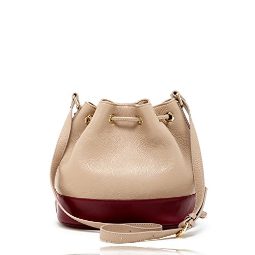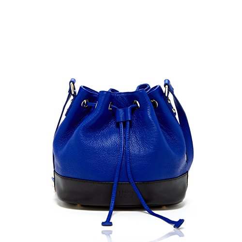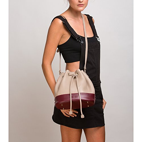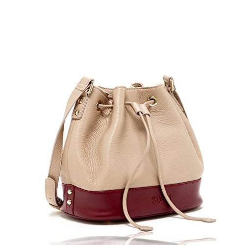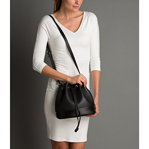 -. Feature : Width: 9.75", Height: 9.5", Depth: 6", Strap Drop: 13"-21" / Genuine Pebbled Leather, Fabric Lining, Cell Phone Slots, Adjustable Crossbody Strap / The Ava bucket bag offers a casual but elegant look, perfect for weekend wear or a fun day of shopping. / Featuring a drawstring top and a magnetic closure to ensure P.R.Ivacy, this leather bucket bag is made of soft pebbled leather with smooth leather at the bottom, and includes a fabric-lined interior with convenient cell phone pockets and ample room for all your essentials. The black color comes with a embossed logo in the bottom as well. / An adjustable shoulder strap allows you to wear the bucket bag crossbody style. The Ava is available in black or in color-block styles including neutral beige with a burgundy bottom, or in royal blue with a black bottom.