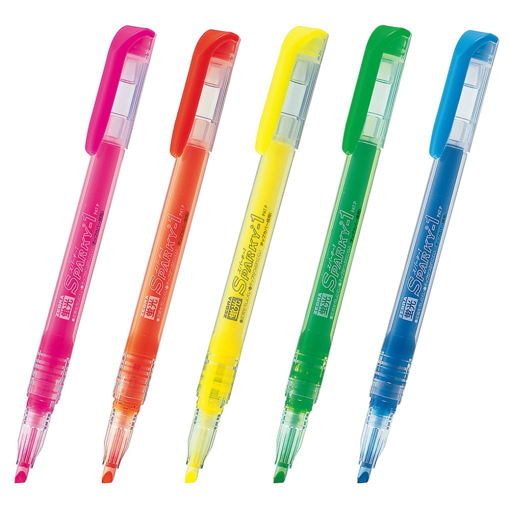 Five color set of direct liquid type highlighter pen which can see the remaining amount of ink.