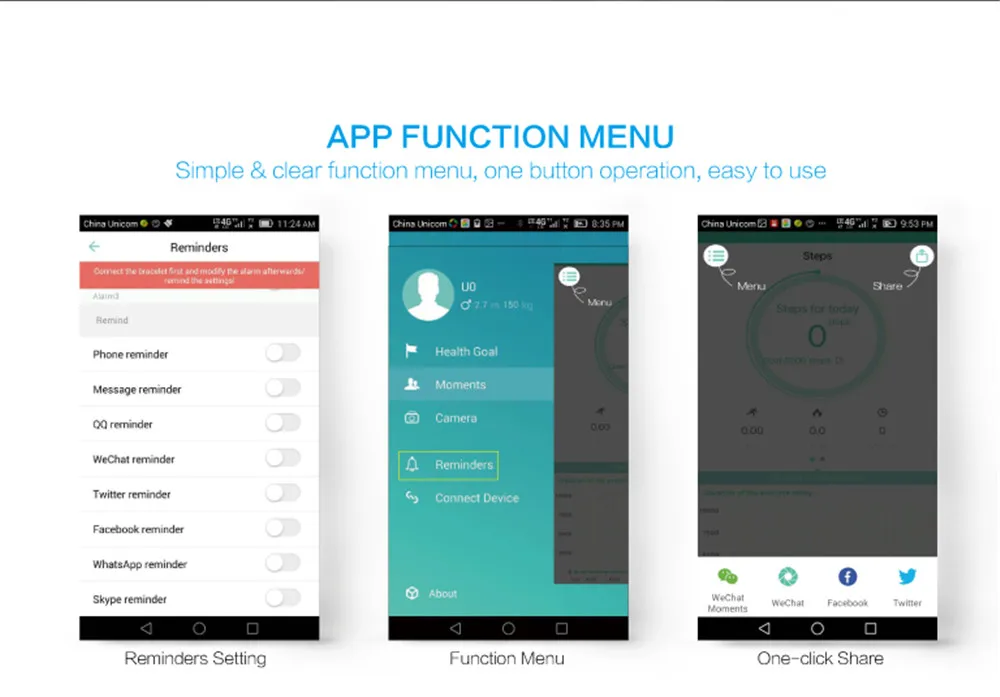 Function:Message Reminder,Passometer,Alarm Clock,Call Reminder,Calendar,Remote Control