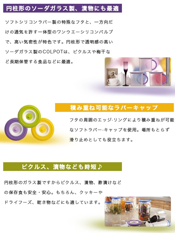 | 商品説明 | クリアなソーダガラスで食品の保存に最適な「COLOPOT(コロポット)」。 二重シリコンとガスケットでできたフタが、容器内をきっちりガードして密封状態にするとともに、空気や水の「もれ」を防ぎます。 付属の専用ポンプで容器内の空気を簡単に取り除くことで、低真空状態に。そのため、食材の品質を長期間維持することができ、乾燥食材も湿気から守れます。 円柱形のガラス製なので、漬物やピクルスなどの保存食も安全・安心に長期保存可能。 クッキーやドライフルーズなどをいれて保存してもお洒落♪ シリコン製のフタなので積み重ねが可能。 カラフルなデザインがキッチンやテーブル周りを華やかに演出いたします。 【サイズ・容量】 パッケージサイズ:約 W308xH110xD92mm パッケージ込重量:約 970g 容量:500mL(1個あたり) ■生産地:台湾 ■素材・成分:フタ:ポリプロピレン+熱可塑性ラバー ボディー:ソーダガラス(フロスト) エアバルブ+ガスケット:シリコン ■パッケージ:化粧箱入り 【注意事項】 カラー:カナリアイエロー・アップルグリーン・ライラックパープル(3色セット) 付属品:ミニポンプx1 使用上の注意 ・粉状の食材はふたの機能を損なわないよう、袋に入れてから使用してください。 ・投げたり、落としたりしないでください。破損する可能性があります。 ・耐熱ガラスではありません。オーブンや電子レンジ等、発熱器具でのご使用はおやめください。 ・ガラス製ですので、お子さまの手の届かない場所に保管してください。 |