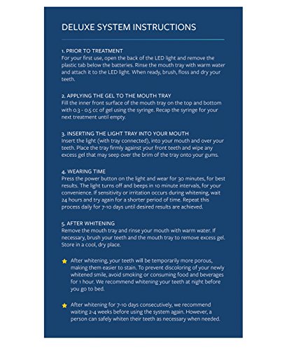 - Feature : Includes 15-20 whitening treatments for multiple whitening sessions. Perfect for whitening teeth in the comfort of your own home. / Teeth whitening gel contains 35% Carbamide Peroxide, the same ingredients used by dentists. / Includes powerful Glow Activation Light with advanced LED technology for faster and brighter whitening. / Use once a day for 30 minutes. Safe for enamel. / See visible results and whiter teeth after just 1 treatment with this whitening kit.