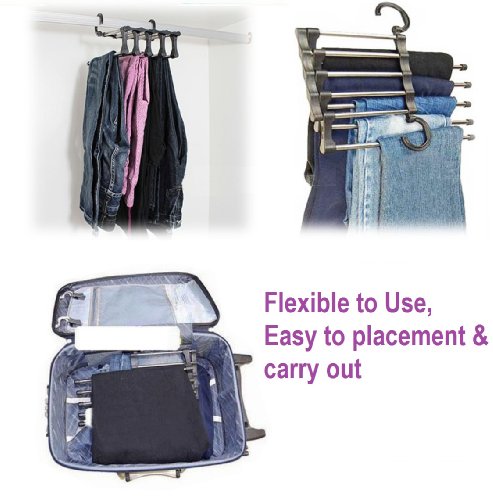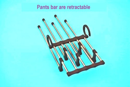 -. Feature : Use both hooks to hang pants horizontally, one hook to maximize closet space / Chrome bar retractable, easy access to individual pants / Quickly transfer pants from closet to suitcase / Durable chrome finished rods keep pants evenly spaced to avoid wrinkles / 2 PCS 5-in-1 Space Saver Pants Hanger