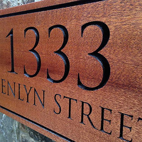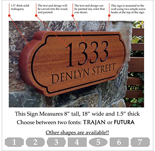 -. Feature : SOLID MAHOGANY ADDRESS SIGN (MEASUREMENTS - 8" HIGH X 18" WIDE) / PERSONALIZATION IS EASY. WE WILL CONTACT YOU WITHIN 24 HOURS OF PURCHASE TO REQUEST YOUR DESIRED TEXT / Your text / address numbers will be deep-carved into the wood and painted / Made from solid mahogany with a sealed satin finish. / We can paint the text any basic color (black, white, red, blue green, etc.)