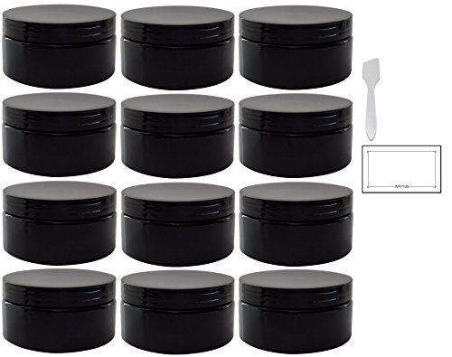 Black PET Plastic (BPA Free) Refillable Low Profile Jar - 8 oz (12 Pack) + Spatulas and Labels