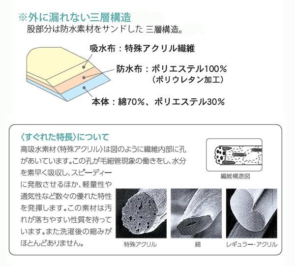 股間部分の裏地は、吸水性に優れた特殊アクリルを使用。防水素材をサンドした3層構造になっているので外へ漏れる心配はありません。表地は綿を主体としているので普通の下着感覚でご使用いただけます。 |