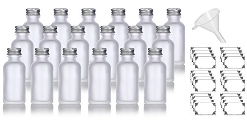1 oz Frosted Clear Glass Boston Round Silver Screw On Cap Bottle (24 pack) + Funnel and Labels for cosmetics, serums, essential oils, aromatherapy, food grade, bpa free
