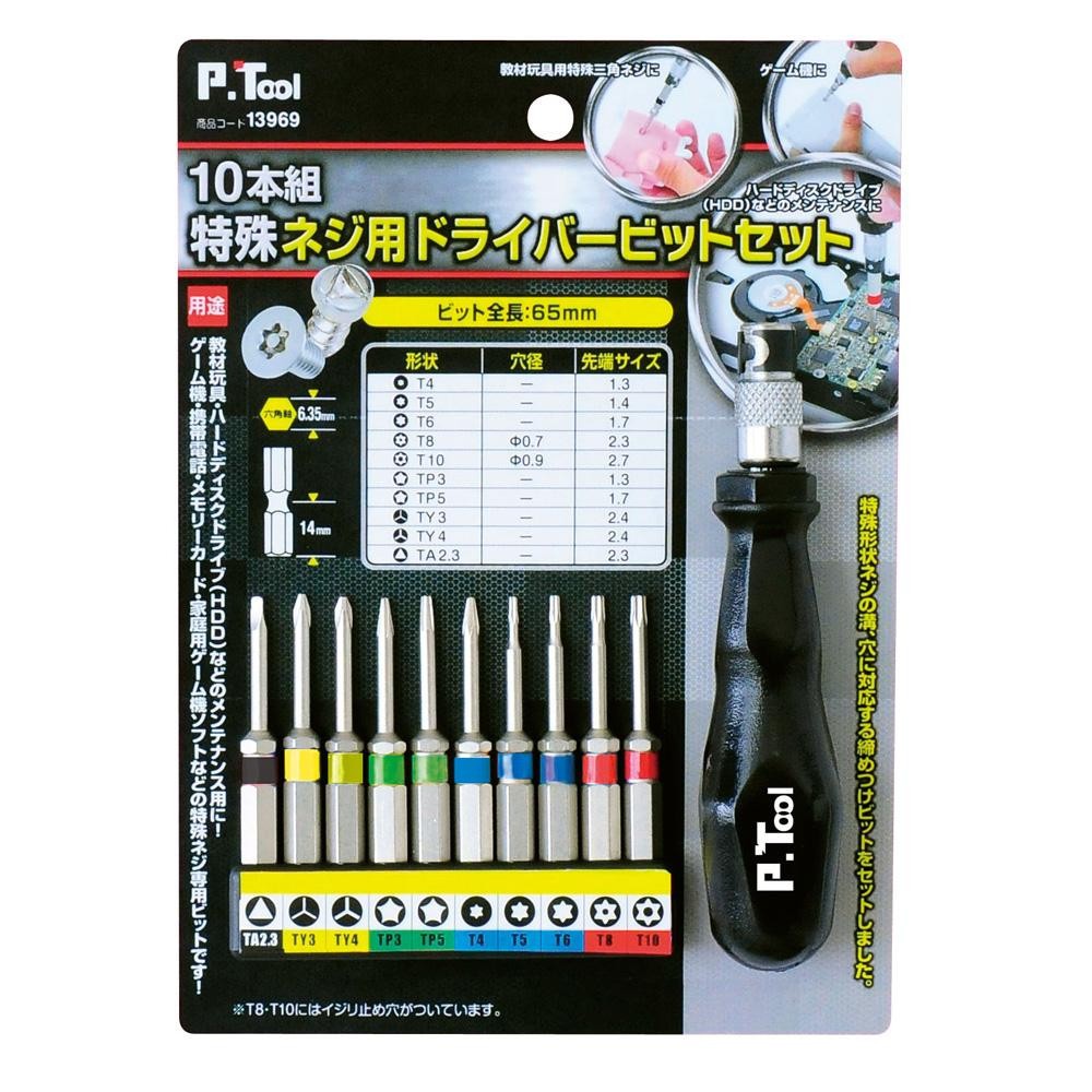 fk094igrjs特殊形状ネジの溝、穴に対応するビットのセットです サイズ 全長65mm 個装サイズ:13×10×3cm 重量 個装重量:209g 仕様 六角軸:6.35mm セット内容 グリップ 10pcビット 製造地 台湾 ゲーム機、携帯電話などの特殊ネジ専用ビットセット ※T8~T10なイジリ止め穴がついています 特殊形状ネジの溝、穴に対応するビットのセットです