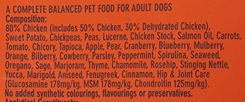 原材料:鶏生肉(骨抜き)50%、乾燥鶏肉 30%、サツマイモ、ヒヨコマメ、エンドウ、アルファルファ、鶏グレイビー、サーモンオイル 1%、ニンジン、トマト、チコリ、タピオカ、リンゴ、ナシ、クランベリー、ブルーベリー、マルベリー、オレンジ、ビルベリー、コケモモ、パセリ、ペパーミント、スピルリナ、海藻、オレガノ、セージ、マジョラム、タイム、カモミール、ローズヒップ、セイヨウイラクサ、ユッカ、マリゴールド、アニス果、フェヌグリーク、シナモン、グルコサミン 350mg/kg、MSM 350mg/kg、コンドロイチン 240mg/kg、酸化防止剤(天然ミックストコフェロール)