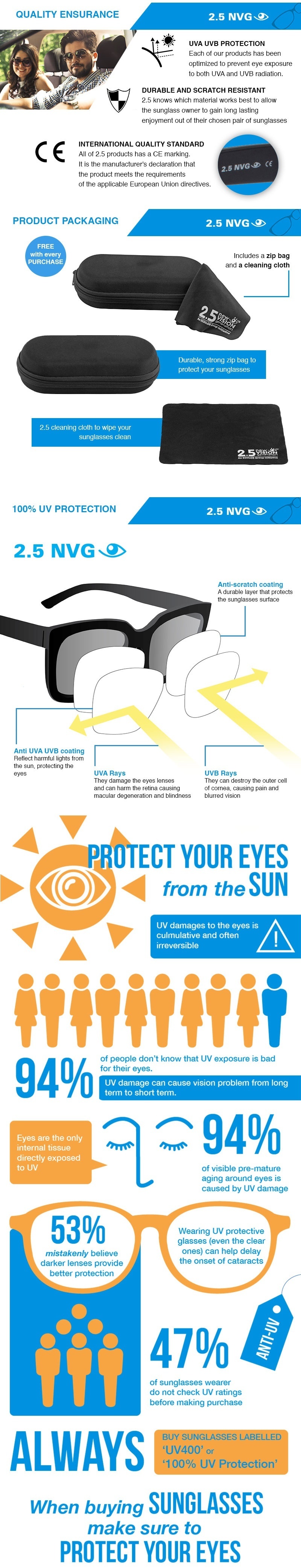 These 2.5 NVG sunglasses are perfect for Women. This BLACK color model, with round shape and shiny rhinestones on the temple, comes with BLACK gradient color lenses, 100% UVA/UVB protection to shield your eyes from the hamrful sun damage. The sunglasses are delivered with a free light and durable zip case to protect your sunglasses.