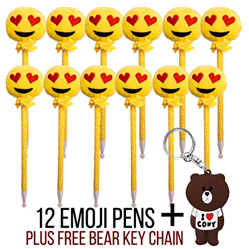 -. Binding : Office Product -. Brand : DIYJewelryDepot -. Color : Yellow -. EAN : 7156461487775 -. Feature : Tall plush penmojis showing 21st century pop culture reference / Write and show your current mood using this pen with famous emoji faces / Easy-to-grip body with stylish polka dots design / Ideal for school and office use / This pack comes in a set of 12 pens PLUS FREE BROWN BEAR KEY CHAIN -. Label : DIYJewelryDepot -. Manufacturer : DIYJewelryDepot -. MPN : 555 -. PackageQuantity : 13 -. PartNumber : 555 -. ProductGroup : Art and Craft Supply -. ProductTypeName : ART_SUPPLIES -. Publisher : DIYJewelryDepot -. Studio : DIYJewelryDepot -. Title : DIYJewelryDepot Smiling Face Heart-Shaped Eyes Emoji Pens Plush Pen 12 Pcs + Free Bear Key Chain