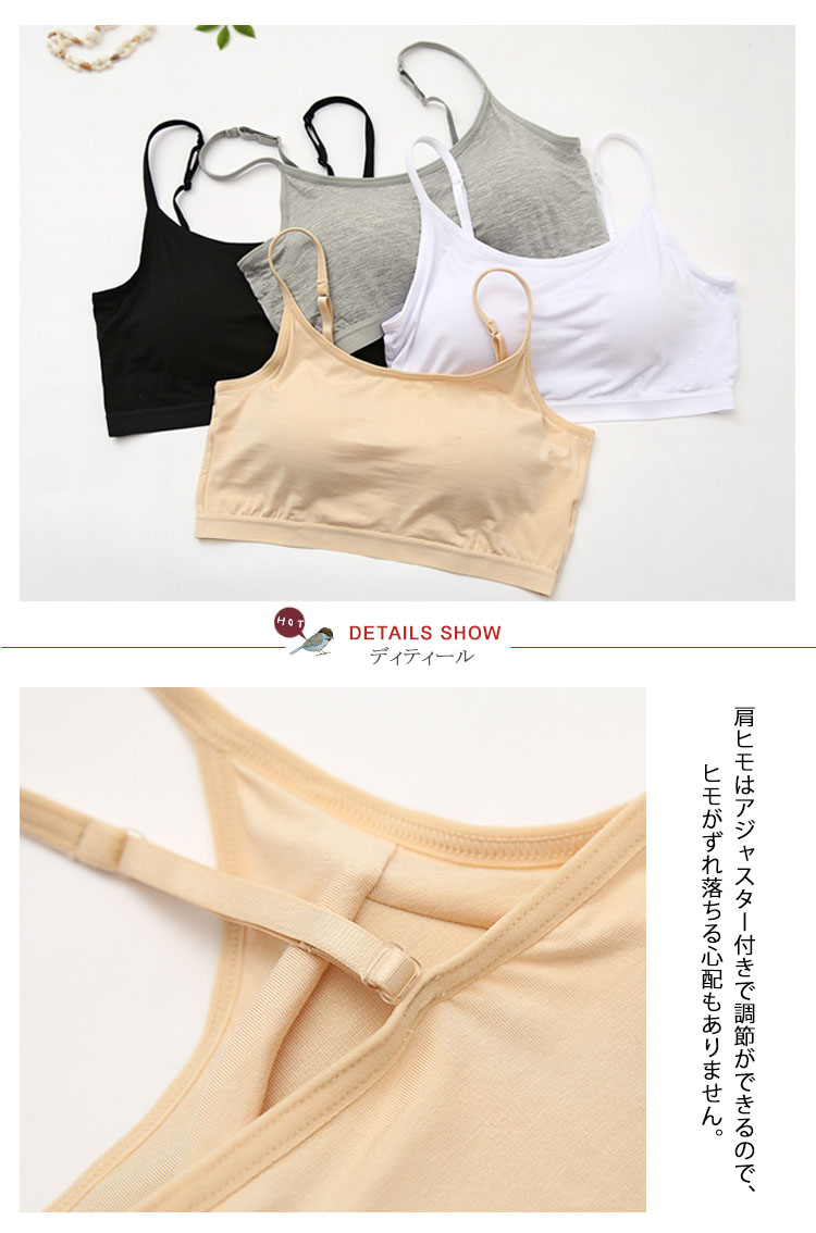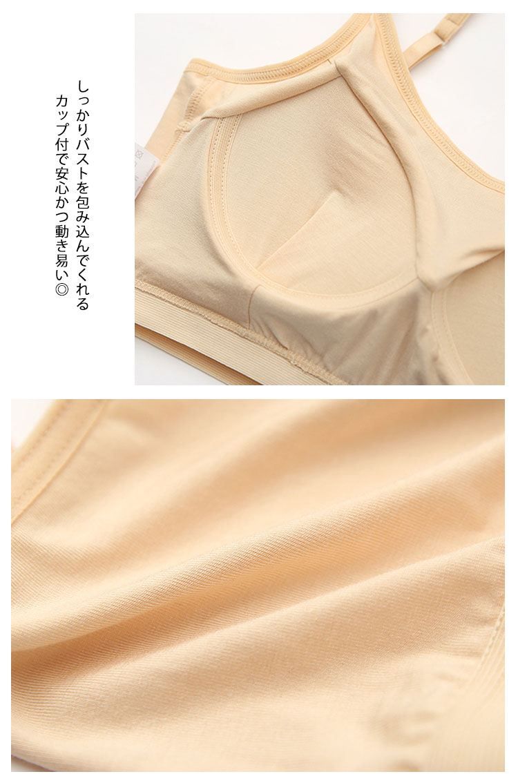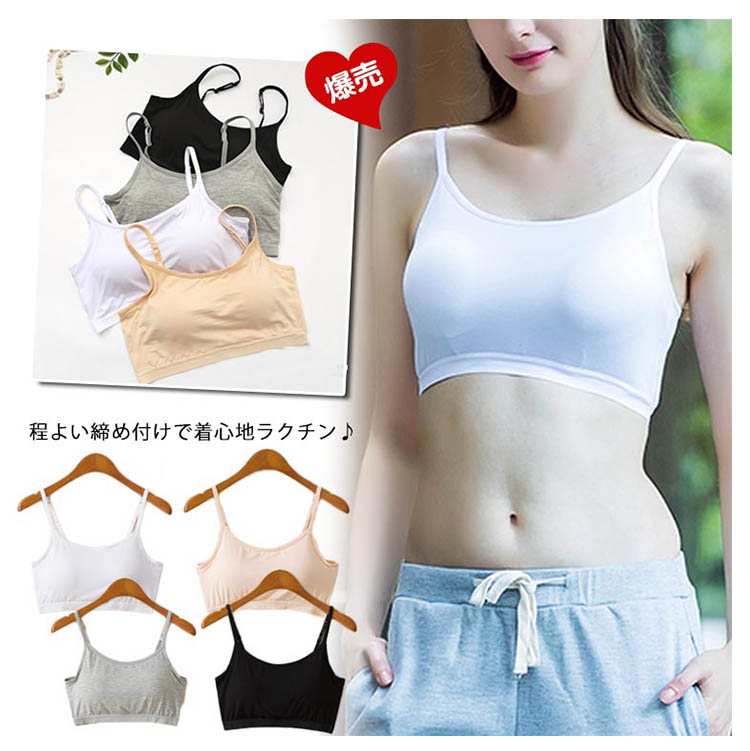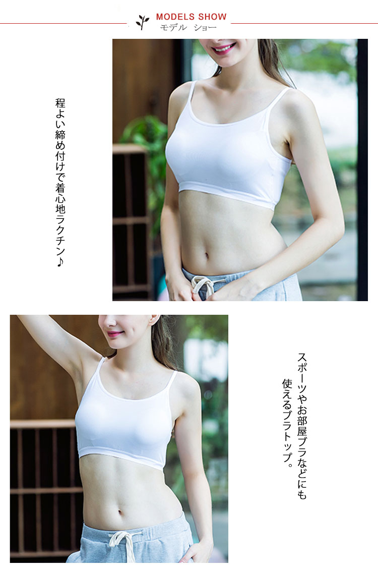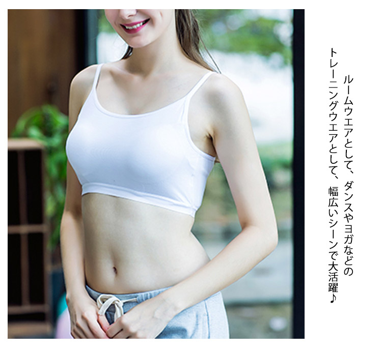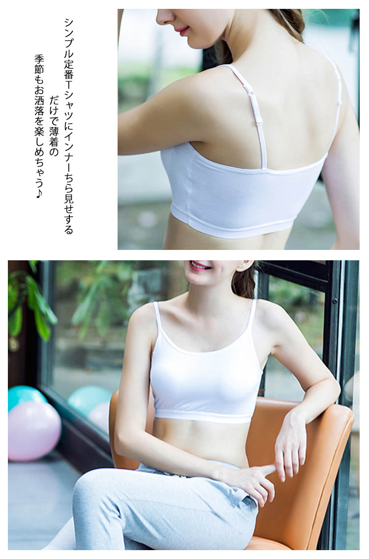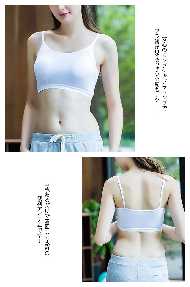 | 程よい締め付けで着心地ラクチン♪スポーツやお部屋ブラなどにも使えるブラトップ。シンプル定番Tシャツにインナーちら見せするだけで薄着の季節もお洒落を楽しめちゃう♪安心のカップ付きブラトップでブラ紐が見えちゃう心配もナシ!!!1枚あるだけで着回し力抜群の便利アイテムです! | |