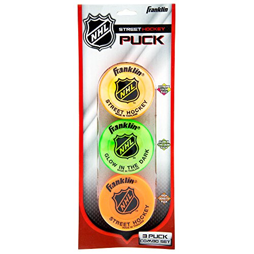 Studio : Franklin Sports, Inc. Publisher : Franklin Sports, Inc. Binding : Sports Product Description Get your hockey fix during the summer when you're forced off the ice with the Franklin Sports NHL Street Hockey Puck Combo 3-Pack. This combo pack includes high-density pucks that deliver unmatched strength and superior visibility, plus a glow-in-the-dark puck that will allow you and your friends to play deep into the night. Street hockey is a fun way to work on your puck-handling skills off the ice, keeping you connected to the game you love during those hot summer months. 1 high density puck 1 extreme color high density puck 1 glow in the dark puck. 0