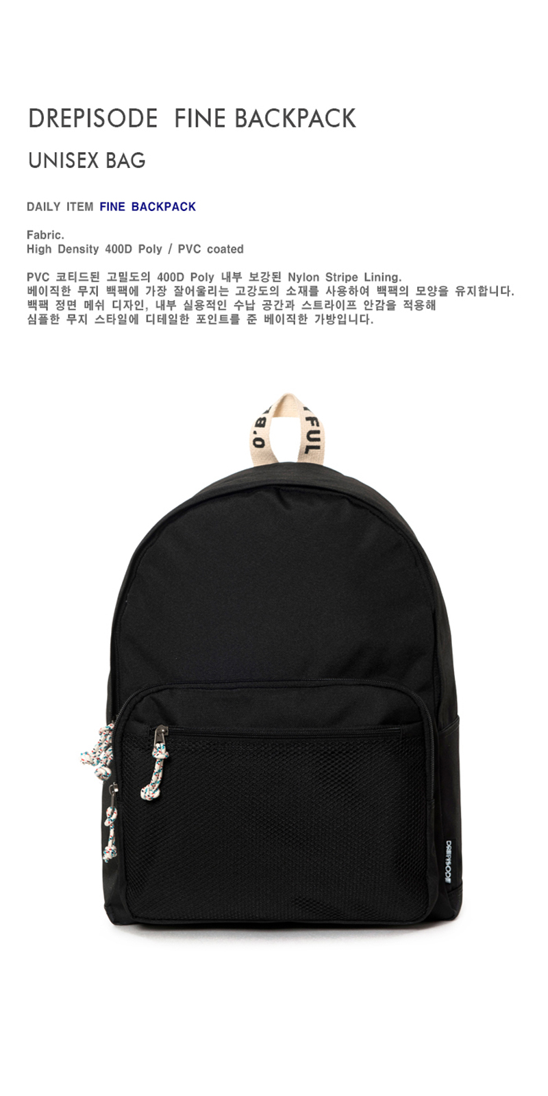 트렌디한 메쉬 포켓을 포인트로 한 심플하며 베이직한 백팩입니다.