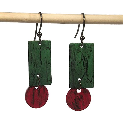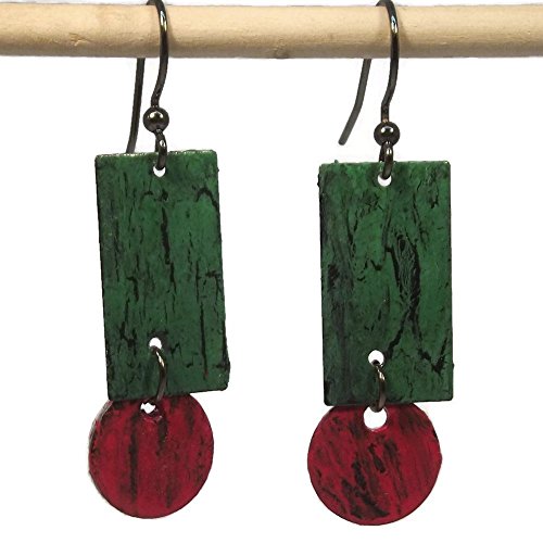 -. Title : 1-7/8" Hand Crackle Painted Geometric Dangle Drop Earrings, OOAK, One of a Kind, Green & Red