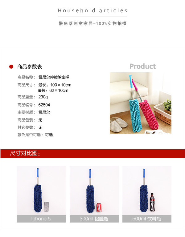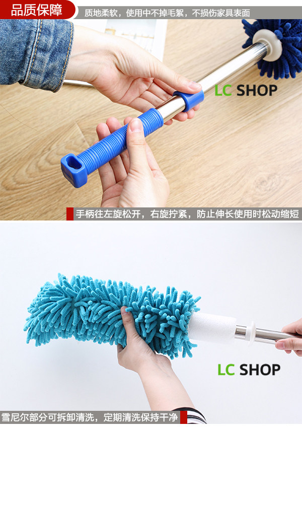 可伸缩的除尘掸,高一点的地方也能轻松拂去灰尘,柔软的材质不会刮花家居,用作车用除尘掸也可以哦! 品牌: 家减尘除 掸头材质: 雪尼尔 Dust Shan scalable, high somewhere can easily dusted, soft material will not scratch home, used car dust Shan can be oh! Brand: House dust reduction except Shan head material: chenille