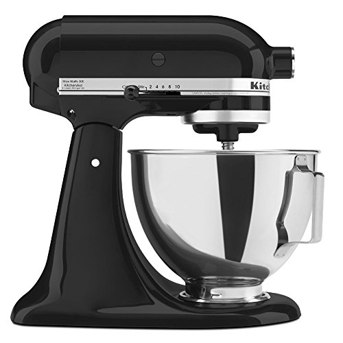 This KitchenAid Stand Mixer has a strong 300-watt motor that delivers the power to handle the heaviest mixtures, and mix large batches easily. The 4.5-quart polished stainless steel bowl with ergonomic handle is big enough to handle large batches of heavy mixtures. Its ergonomically designed handle is contoured to fit the hand and makes lifting the bowl more comfortable. The flat beater, dough hook, and the professional wire whip add to the versatility of the mixer. The flat beater is the ideal accessory for mixing normal to heavy batters. From cake mixes to firm cookie dough, the flat beater mixes quickly and thoroughly. The dough hook mixes and kneads yeast dough, saving both time and the effort of hand-kneading. The wire whip incorporates the maximum amount of air in whipped mixtures for fluffier whipped cream and angel food cakes. The tilt-back mixer head allows for easy access to bowl and beaters. Flat beater: Quickly and thoroughly mixes ingredients for everything from pancakes for breakfast to specialty treats for the holidays. Dough hook mixes and kneads yeast doughs, saving the effort of hand kneading. Wire whip will incorporate the mixtures for fluffier whipped cream and lighter angel food cakes. pouring shield not included b>The KitchenAid Tilt-head stand mixer with 4.5-quart stainless steel mixing bowl and 10 speeds easily mixes, kneads and whips your favorite ingredients. With a sleek onyx black finish for a modern look, this mixer is a must-have tool for the home cook. b>Brand: KitchenAid Included items: One (1) stainless steel mixing bowl, one (1) dough hook, one (1) wire whip, one (1) flat beater Type: Tilt-head stand mixer Finish: Glossy Color options: Onyx Black Style: Modern Settings: 10-speed slide control Wattage: 300 Capacity: 4.5 quarts Model: KSM85PBOB Dimensions: 14 inches high x 8 inches wide x 14 inches deep Made in USAFeature