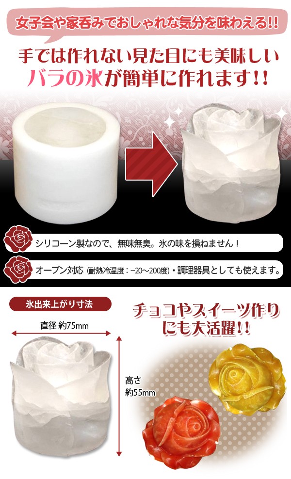 バラの氷が出来る製氷器です。手では作れない見た目にも美味しいバラの氷ができます。シリコーン製なので無味・無臭!オーブン等にも使用でき、調理器具としても使えます。 |