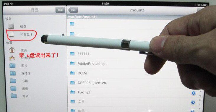 特别注意:读卡器在没有越狱之前只能读图片文件,越狱之后下载ifile软件可以对U盘或者SD卡的任何内容进行管理和读取。利用ifile软件可以把U盘里面的内容复制到ipad,也可以把ipad里面的内容复制到U盘!