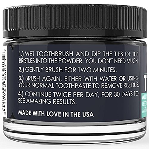 Dip a moist toothbrush in the powder and use every day to gradually and gently whiten teeth while brushing. Use in place of regular toothpaste, or brush with your normal toothpaste immediately after. Contains All Natural Bentonite Clay, Organic Coconut Activated Charcoal, Coconut Oil, Organic Mint Extract, Organic Orange Peel ExtractUsage and Safety - This Is A Fine Black Powder