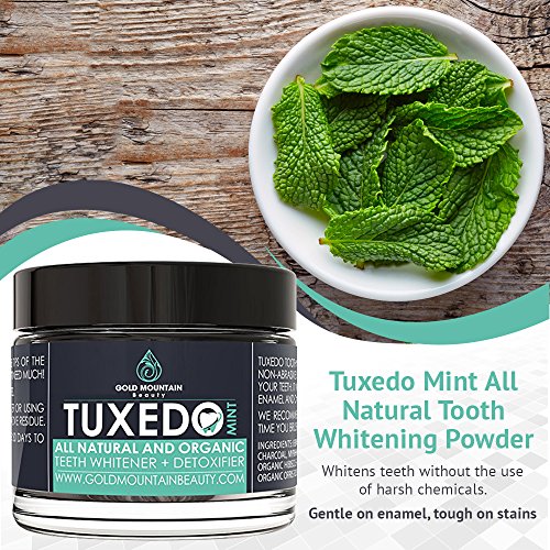"TUXEDO" GENTLY WHITENS OVER TIME: Our natural whitening formula gently removes stains from coffee, wine, etc., to reveal whiter, brighter teeth. Use daily for 30 days to see results. This product does NOT bleach teeth with chemicals. Natural teeth whitening for sensitive teeth. 32 gram jar.