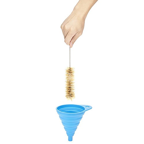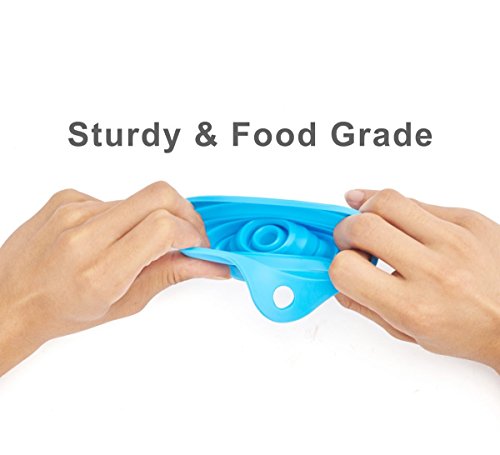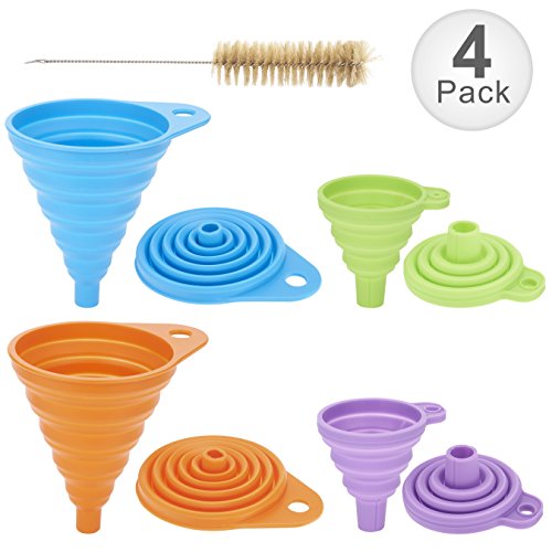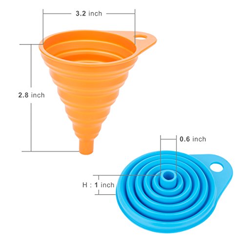 - [ MADE OF HIGH QUALITY MATERIAL ] Flexible funnel with 100% food grade silicone, BPA Free, FDA Approved, soft texture, easy to fold, easy storage, not easy to oil, clean. Your purchase includes 2 blue and orange large size funnel,2 green and purple small size funnel, and we give a free cup brush.
