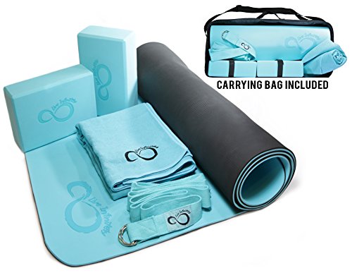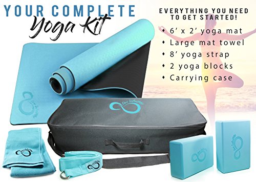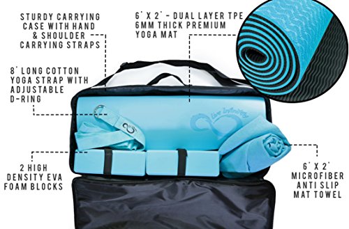 Complete 6 Piece Yoga Set by Live Infinitely- 6mm Dual Layer Non-Slip TPE Yoga Mat, 2 EVA Foam Blocks, 9’ Cotton Strap, Mat Sized Exercise Towel & Carrying Case- Perfect Kit For Any Yogi & Beginners