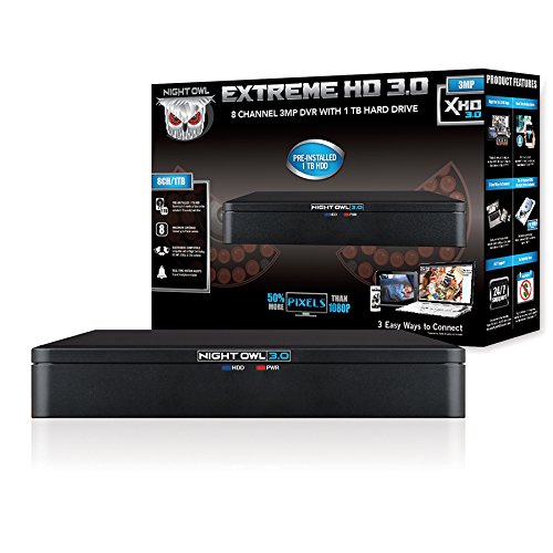 -. Binding : Electronics -. Brand : Night Owl -. Color : Black -. EAN : 0810830025414 -. Feature : 3MP DVR with 1 TB pre-installed hard Drive. Backwards compatible with all Night Owl Analog, 1080P and 720P cameras. Cameras not included. / View & Playback Footage Directly from Your Smart Device (1)(2)(4)(5). Free Night Owl X / Night Owl X HD Apps with Simple Setup (1)(2)(4)(5) / Absolutely no monthly fees! / Real-Time Motion Alerts (1)(2)(4)(5) / 24/7 technical phone Support with EZ Warranty returns -. Label : Night Owl -. Manufacturer : Night Owl -. Model : DVR-X3-81 -. MPN : DVR-X3-81 -. NumberOfItems : 9 -. PackageQuantity : 1 -. PartNumber : DVR-X3-81 -. ProductGroup : Photography -. ProductTypeName : SURVEILANCE_SYSTEMS -. Publisher : Night Owl -. Studio : Night Owl -. Title : Night Owl X3-81 3MP DVR with Hard Drive 8 Channel Extreme HD, Black (DVR-X3-81) -. UPC : 810830025414