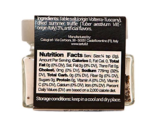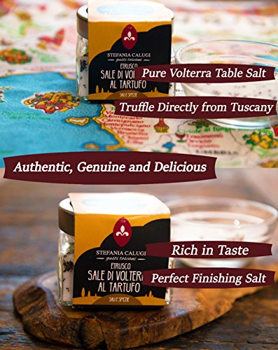 - EXTRAORDINARY DELICACY: Product of Italy. Made with table salt from the Tuscan town of Volterra (considered one of the purest on earth) and black summer truffles. Truffle salt is a "finishing salt". It should be added at the end of the cooking process as seasoning to egg, meat, fish, pasta, salads and french fries. This process is highly suggested for the most exquisite taste.