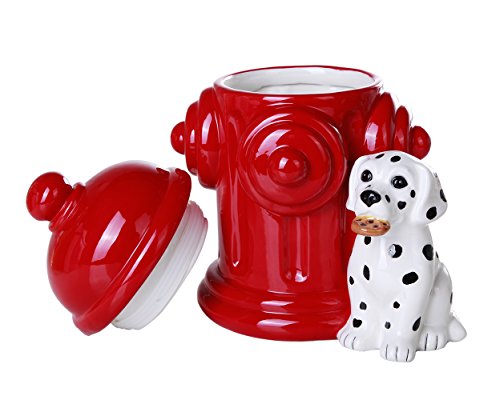 Product Description True happiness comes from within and it is certainly a true statement for this firehouse Dalmatians and Fire Hydrant Ceramic Cookie Jar. Keep you freshly baked goodies inside the cookie jar. This oven cookie jar is quality crafted and is a cheerful addition to your kitchen counter. It comes with an air tight lid to keep your baked goods fresh and is easy to clean. It stands 6.5"W x 8"H. Get one for yourself or as a gift for your friends and family today! 0