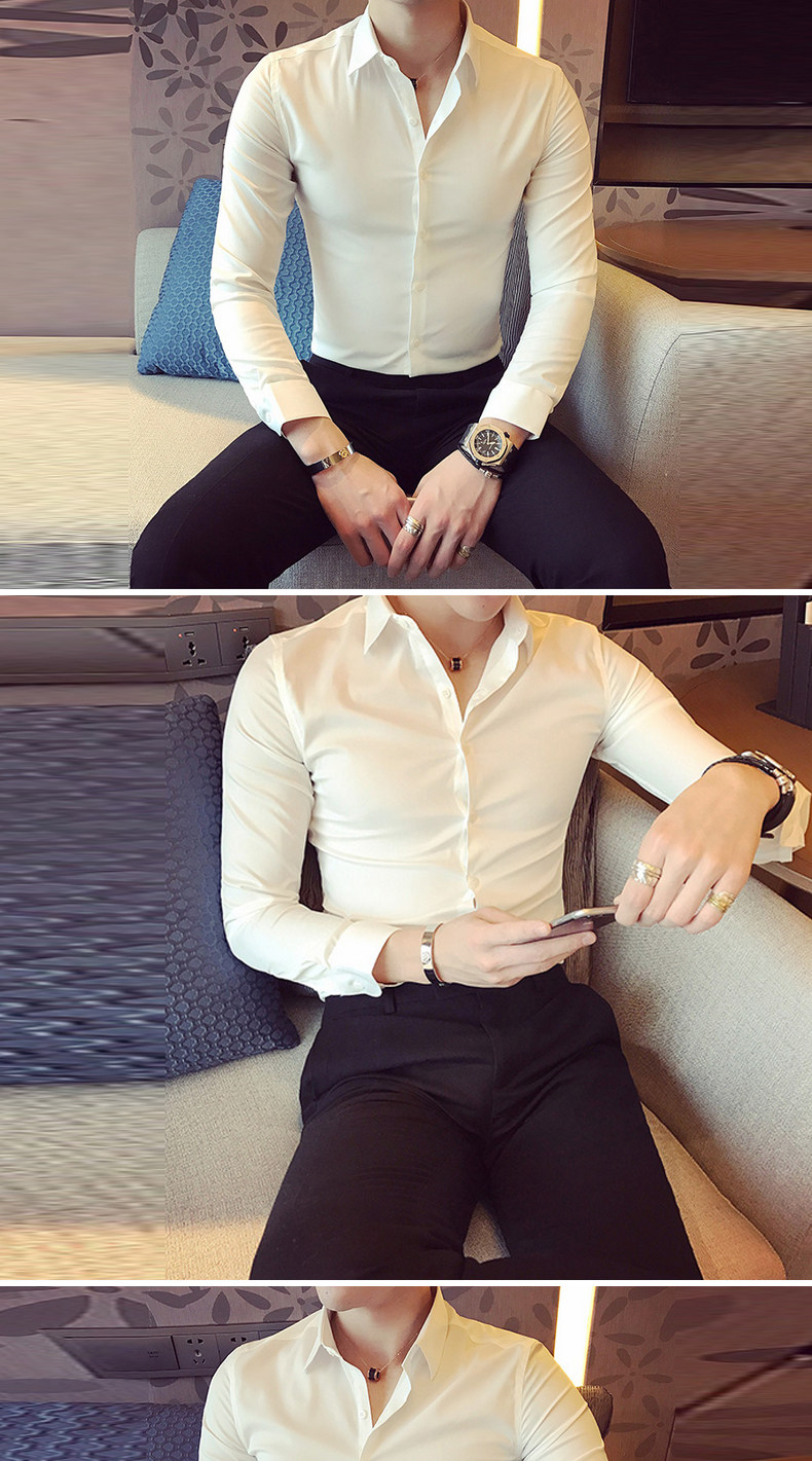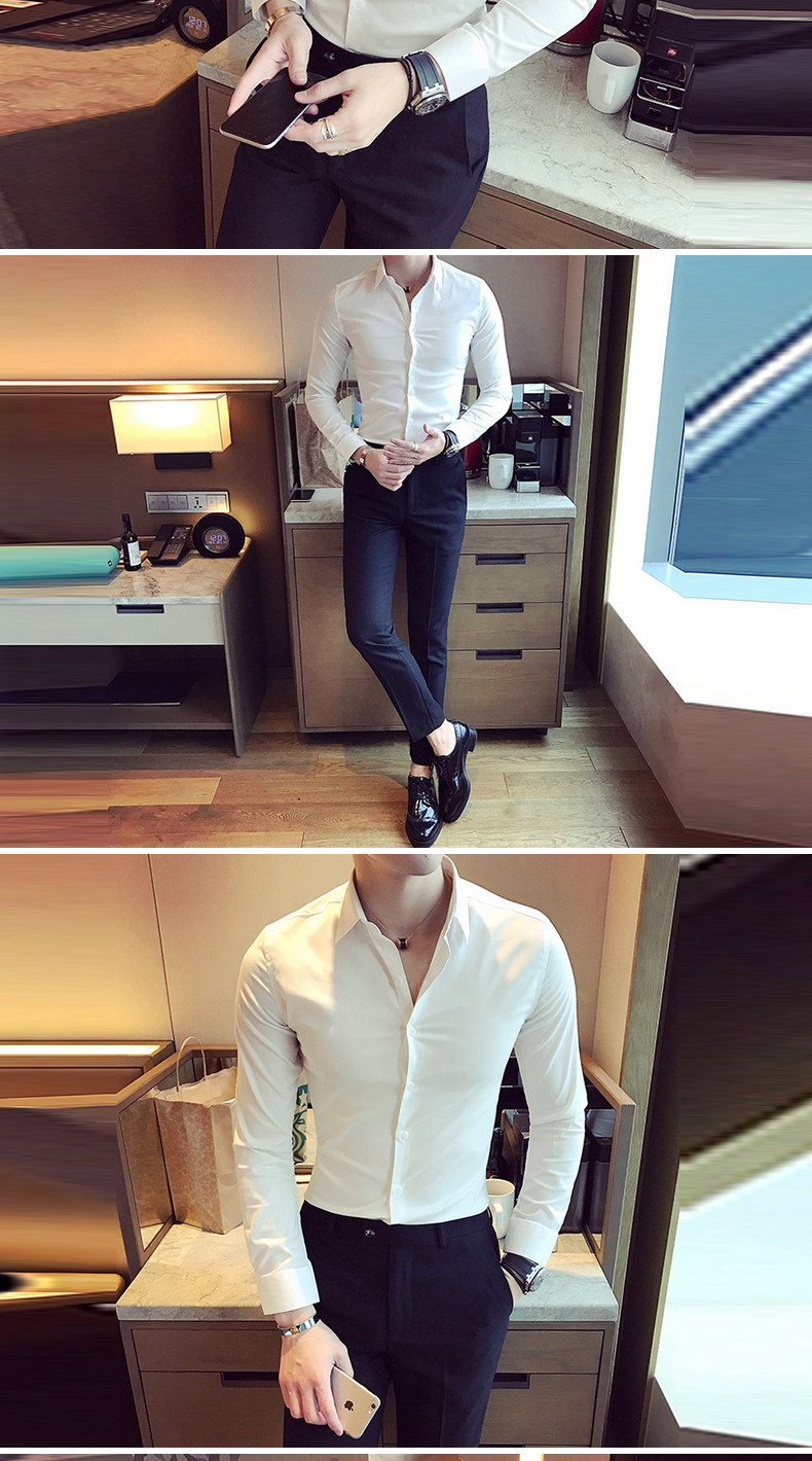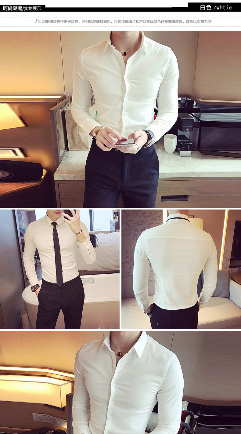 春秋青年修身款白色发型师衬衫韩版男士英伦长袖衬衣潮流简约男装