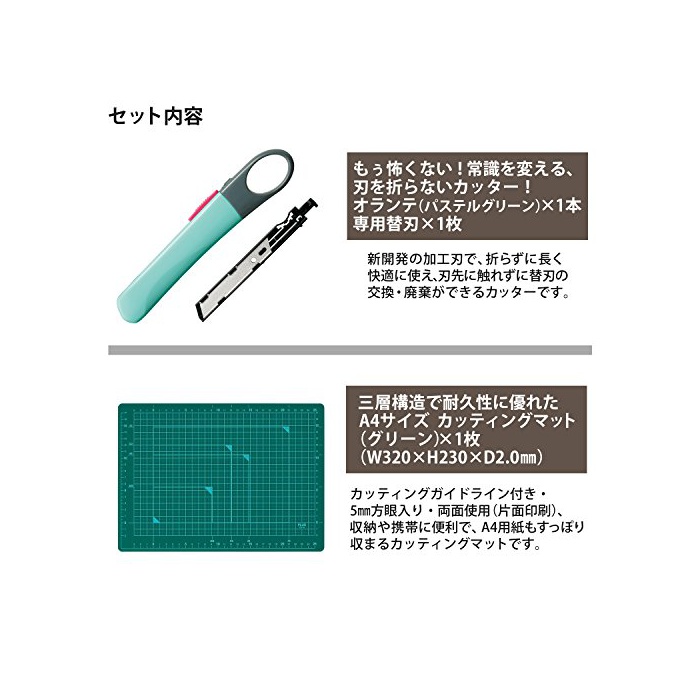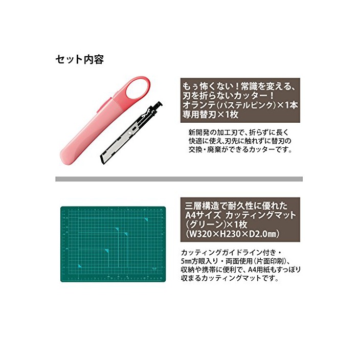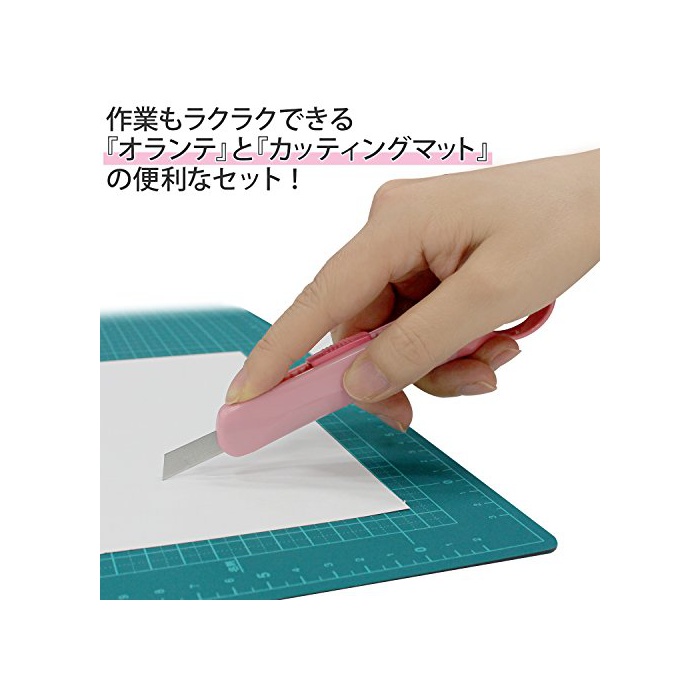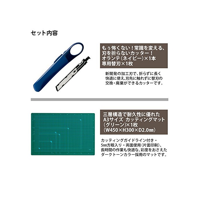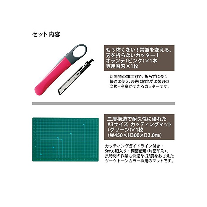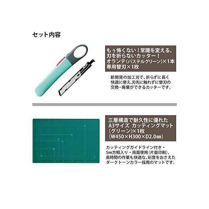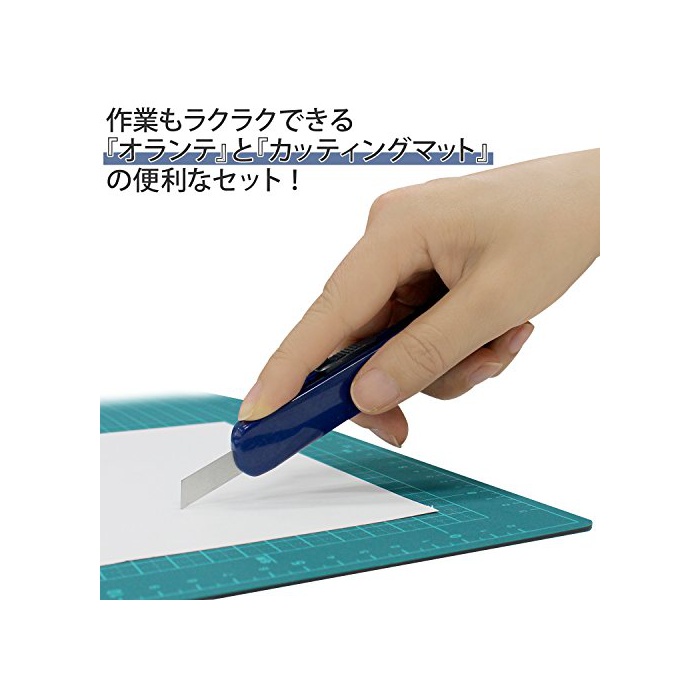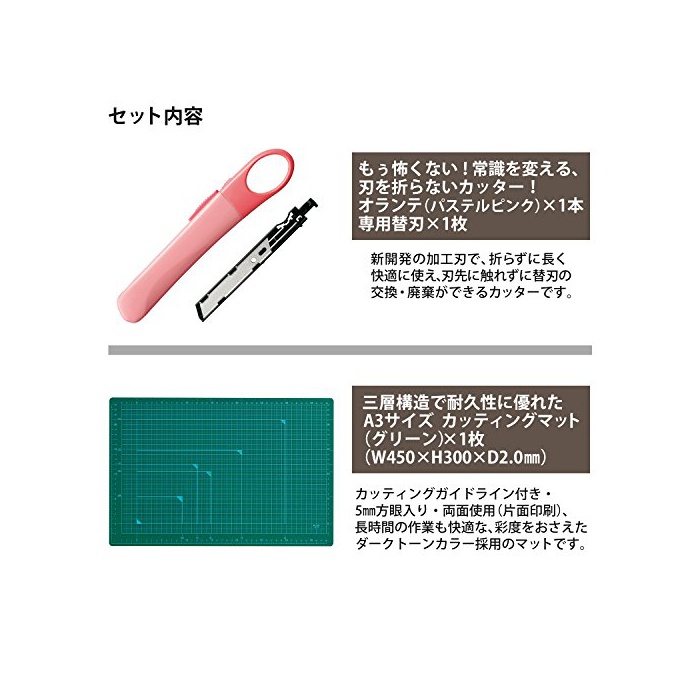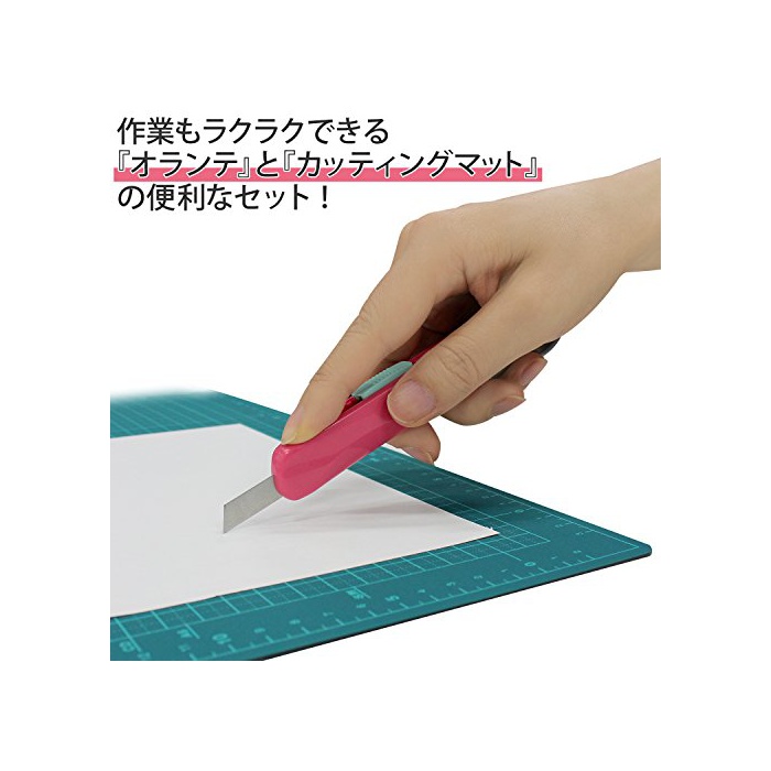 칼을 접지 않아도 쾌적하게 쓸만한 커터「오라《데》」와,양면 쓸만한다「커팅 매트」의 세트.