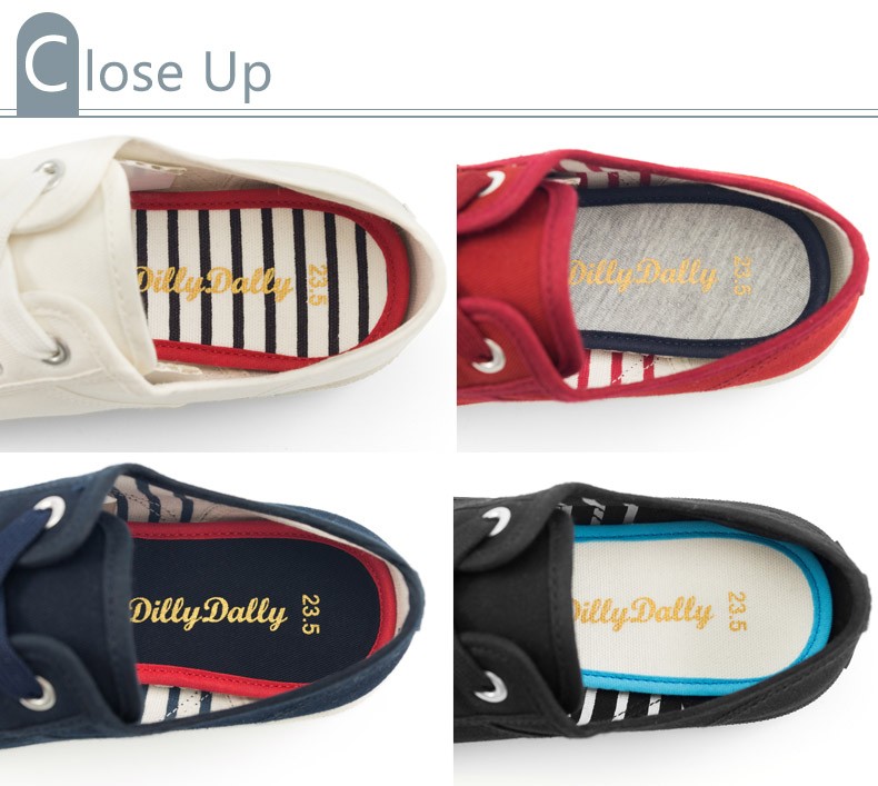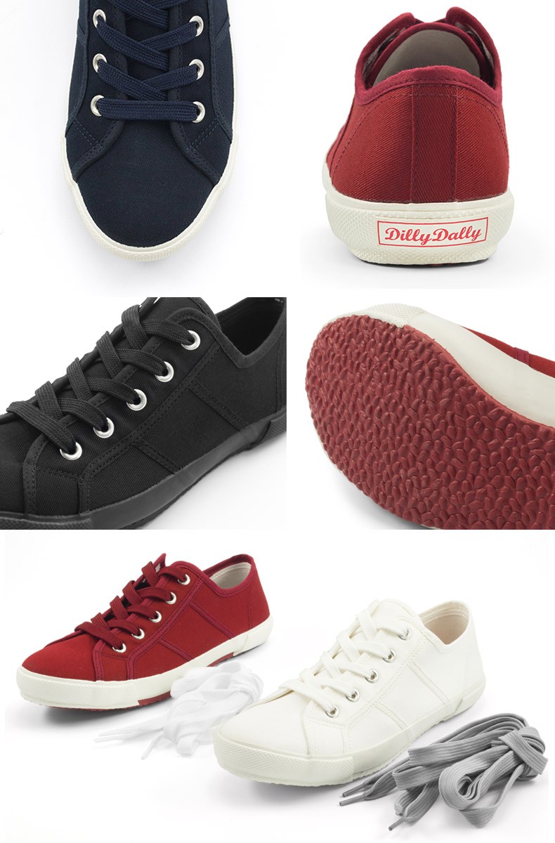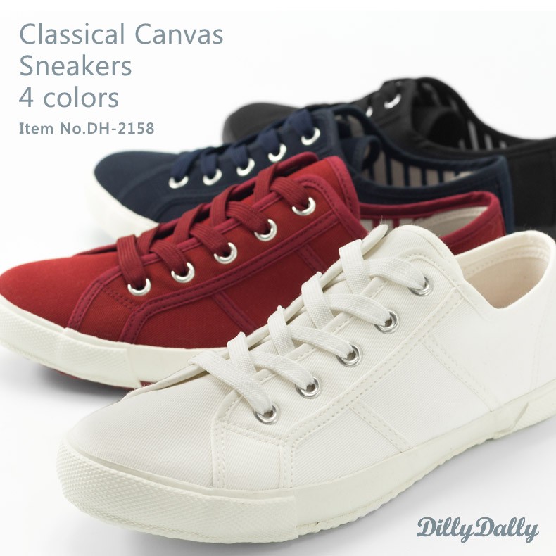 【送料無料/あすつくOK】◆Dilly Dally クラシック キャンバス スニーカー◆スリムなデザインで足元がスタイリッシュに。カジュアルスタイルだけでなく、色んなコーデの外しアイテムとしても。ふわふわ高反発クッションを使用しているので、足に優しい履き心地。多少小さめな作りなので、幅広の方はワンサイズ上をオススメします。※撮影は室内で行われており、ライティングにより実物と色味が少し異なる場合がございます。※採寸はスタッフが手作業で行っており、少々の誤差が生じる場合がございます。■足幅…約7.1-7.9cm(22.5-24.5cm)■ワイズ…D程度■ヒール…約2.5cm■片足重量…約230-270g(23-24.5cm)■素材…キャンバス■ブランド…Dilly Dally■生産国…Taiwan■商品コード…DH-2158◆アイテム キーワード◆レディース靴 スニーカー キャンバス 春 夏 秋 冬 2016 クラシック クラシカル ローテク ブラック 黒 ホワイト オフホワイト 白 レッド ワイン バーガンディ 赤 ネイビー 紺 カジュアル