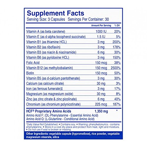 -. Binding : Health and Beauty -. Brand : HCF -. EAN : 8852889526476 -. Feature : What You Get? - The one month supply of HCF Happy, Calm & Focused brain supplement (fueled by F&Q amino acids & 15+ pure & effective neuro-nutrients) contains 90 easy to swallow vegetable capsules. / Guaranteed - HCF Happy, Calm & Focused is hypoallergenic, and contains the purest neuro-nutrients obtainable: no preservatives, no chemicals, no coatings, no calories, no sweeteners, no enhancers, no yeast, no fragrance, no dairy, no gluten, no nuts, no wheat. / HCF Happy, Calm & Focused Benefits - Helps enhance focus*, increase concentration*, sustain feeling happy*, feel internally calm*, promotes healthy sleep cycles*, helps increase attention*, helps improve alertness & memory*, helps curb anxious eating*, help losing weight*, strengthens neural pathways*, increase learning abilities*, be energized & strong*, supports hormone balance*, boosts / Manufacturing - We use only high-quality nutraceutical-grade amino acids and associated neuro-nutrients to ensure purity and standardized for maximum effectiveness.* HCF is manufactured according to FDA guidelines in a cGMP certified facility. Safety & quality are our top priorities at The HCF Company. / Verified Experiences - HCF is reviewed by hundreds professionals (real HCF customers). All life-changing experiences are documented and IP stamped by the manufacturer. -. Label : The HCF Company -. LegalDisclaimer : *These statements have not been evaluated by the FDA. This product is not intended to diagnose, treat, cure, or prevent any disease. -. Manufacturer : The HCF Company -. MPN : HCF-2 -. PackageQuantity : 1 -. PartNumber : HCF-2 -. ProductGroup : Health and Beauty -. ProductTypeName : HEALTH_PERSONAL_CARE -. Publisher : The HCF Company -. Studio : The HCF Company -. Title : HCF Happy Calm Focused Brain Supplement - Amino Acids, Vitamins and Minerals for Memory, Attention, Focus, Mood, Concentration, Sleep, Weight Loss, Energy, Confidence and Hormone Balance -. UPC : 798304003048
