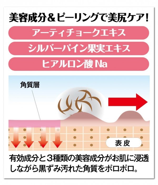 | 自分では見えていないけど意外と目立つおしり。気が付けば「黒ずみ汚れ」「ブツブツニキビ」だらけ…そんなおしりのお悩みに薬用ポロポロピーリング。有効成分がお肌を清潔に保ちニキビを防ぎ、美 白成分を含んだジェルが角質を絡めとり、黒ずみ汚れをポロポロ。 |
