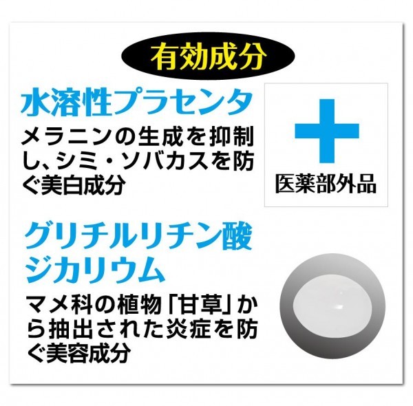 | 成分 | 【有効成分】 水溶性プラセンタエキス、グリチルリチン酸2K 【その他成分】 アクリル酸・メタクリル酸アルキル共重合体、濃グリセリン、米デンプン、混合植物抽出液-34、シルバーバイン果実エキス、カモミラエキス-1、酵母多糖体末、アーティチョークエキス、マロニエエキス、ヒアルロン酸Na-2、塩化トリPOE(5)ステアリルアンモニウム、BG、フェノキシエタノール、香料 |