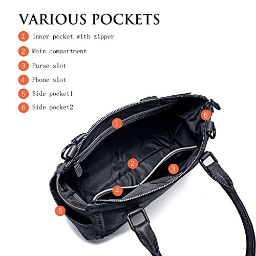 - 1x Main compartment - Keeping precious items like tablet,books,clothes etc.1x Inner pocket with zipper - Keep valuable items like passport,cards,more secure.2x Inner slots - Keep phone,lipstick,keys etc.2x Side pockets.Keep tissues,sun glasses,etc.Some small things easy to get
