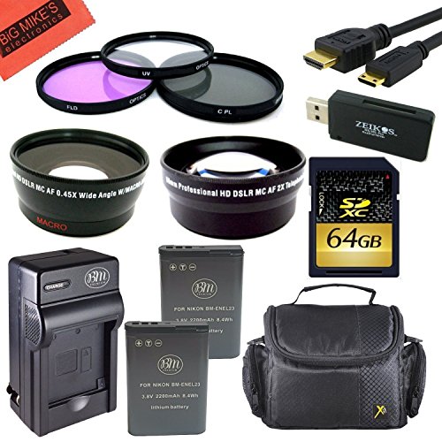Advanced Accessory Kit for Nikon Coolpix P900 Digital Camera - Includes 2 ENEL23 Batteries and Battery Charger + 64GB SD Memory Card + 67mm Filter Kit + Wide Angle and Telephoto Lens + Carrying Case