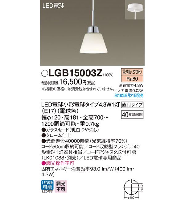 ●光源:LED電球小形電球タイプ4.3W1灯(E17)(電球色)、色温度:2700K、光源寿命40000時間(光束維持率70%)