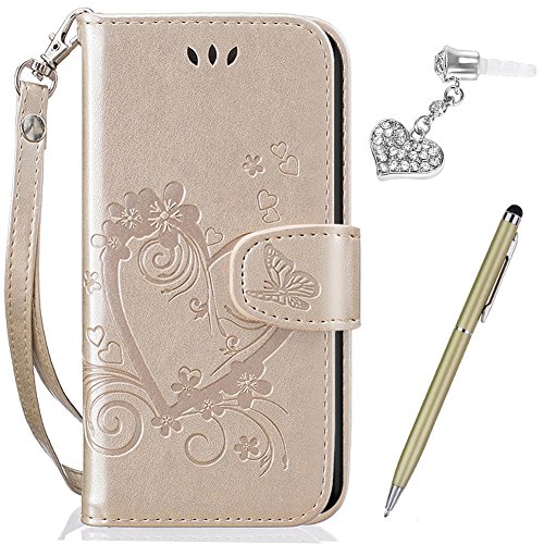 iPhone 6S Case,iPhone 6 Case,ikasus Embossing Love Heart Butterfly Flower Flip Folio Wallet Case PU Leather Stand Card Slots Protective Case +Touch Pen Dust Plug for iPhone 6S / 6 (4.7"),Gold