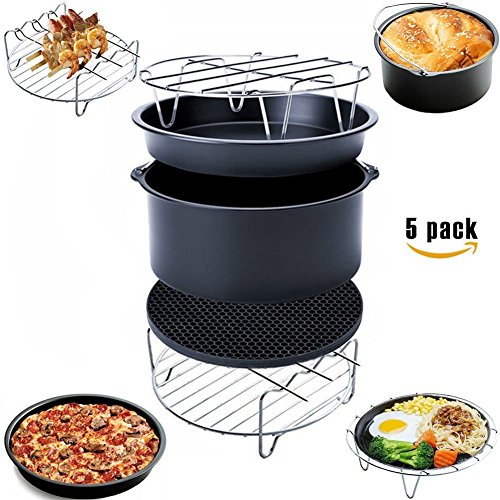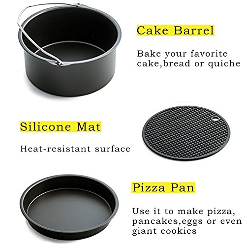 Air Fryer Accessory KIt Includes: 1 x Cake Barrel 1 x Pizza Pan 1 x Metal Holder 1 x Multi-Purpose Rack with Skewers 1 x Silicone Mat