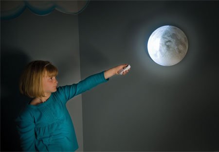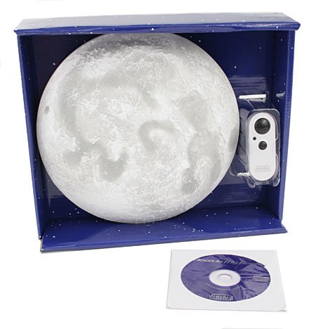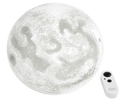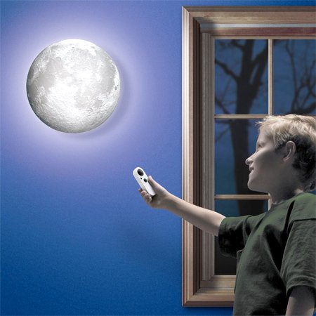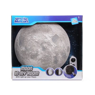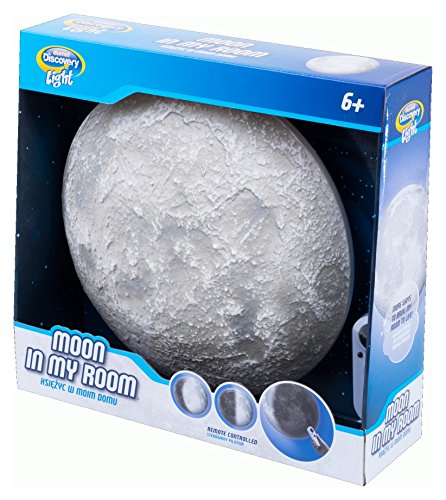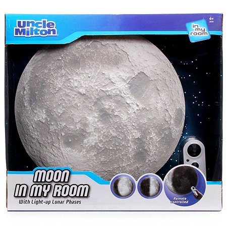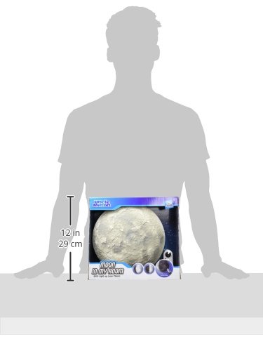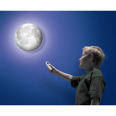 Product Description Turn your room into an authentically detailed 3-D lunar landscape. After your child is all tucked in for the night, Moon in My Room creates a peaceful, glowing effect for a night full of sweet dreams. Its whimsical effect is fun for adults, too. It features Automatic or annual function shows 12 main phases of the moon and the 15-minute audio CD provides a guided tour to the moon. It can by hanged on wall and it requires 2 "AAA" and 4 "AA" batteries, which are not included. 0