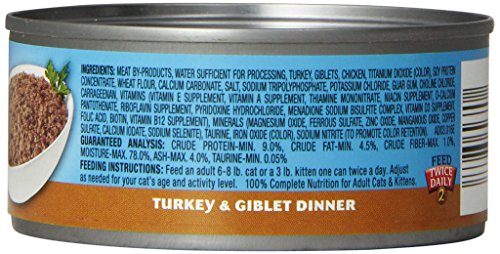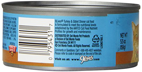 9Lives Ground Turkey and Giblet Dinner is formulated with sufficient water for easy digestion. 9Lives cat food helps regulate cholesterol levels and relieve stress. It also maintains healthy bones. Vitamin E promotes respiratory health.Feature
