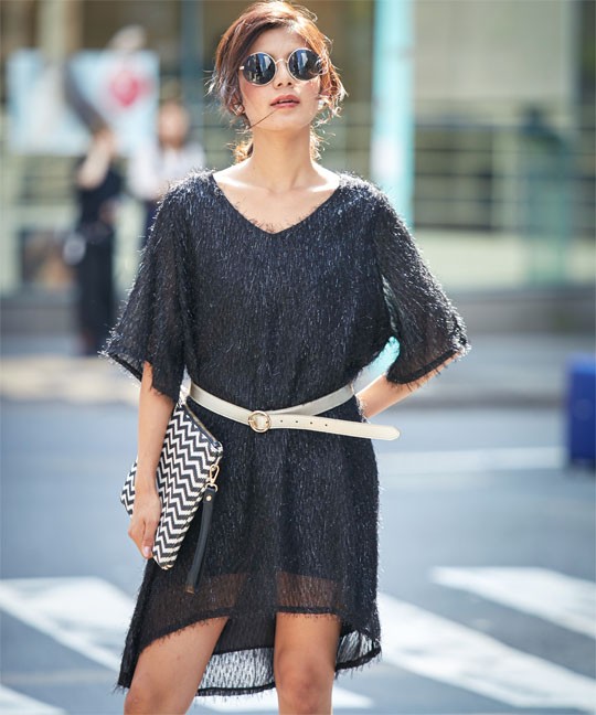 ベルトでシルエットにメリハリをつけるとトレンドスタイルです。