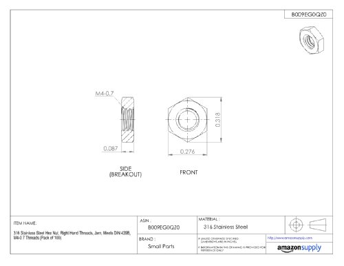 316 Stainless Steel Hex Jam Nut, Plain Finish, DIN 439B, Metric, M4-0.7 Thread Size, 7 mm Width Across Flats, 2.2 mm Thick (Pack of 100)