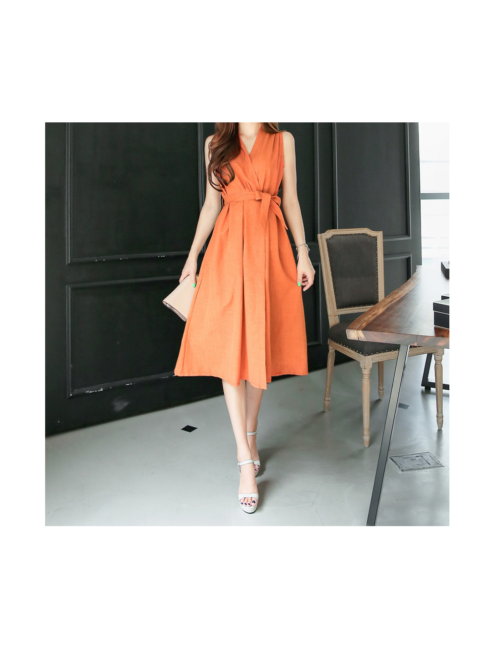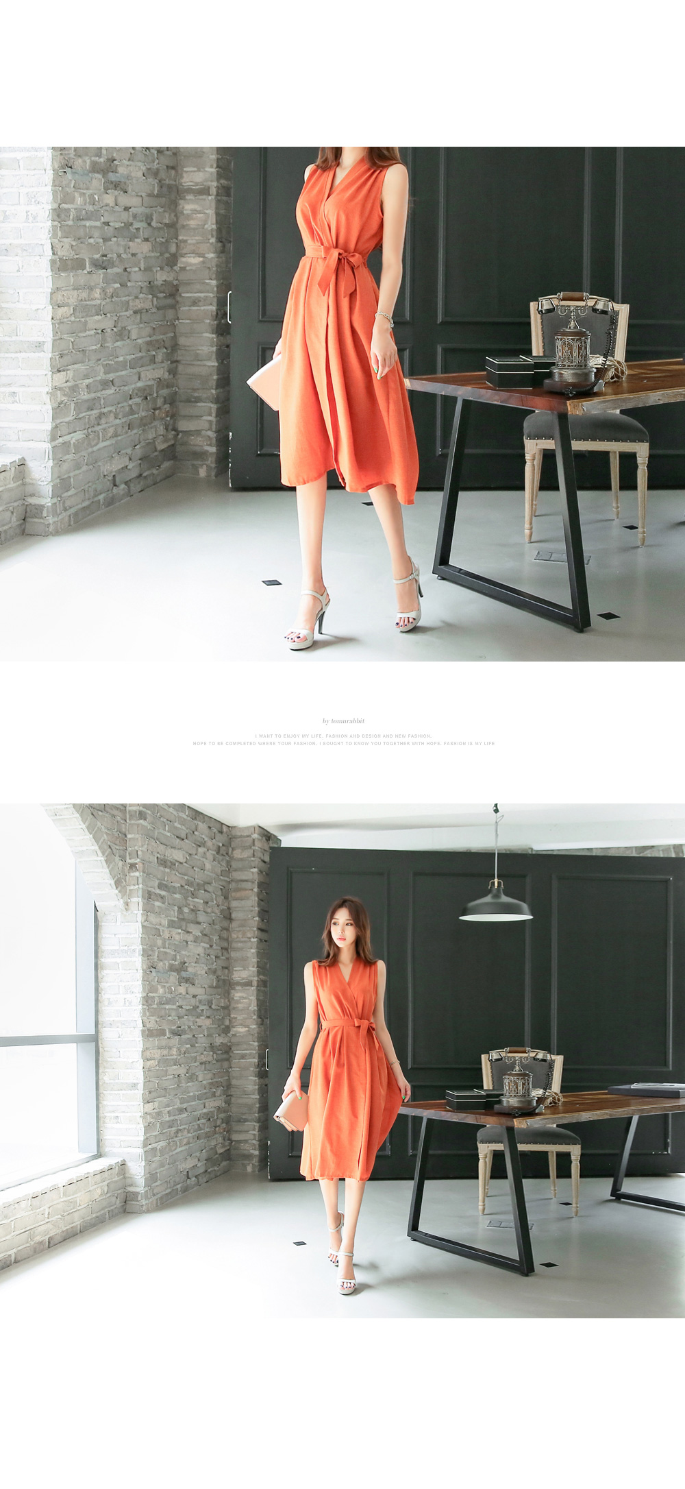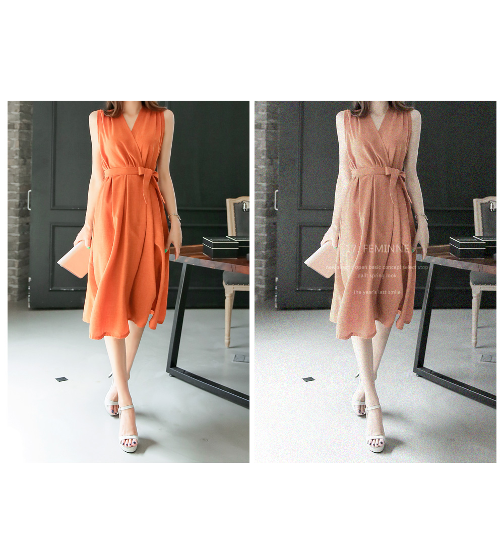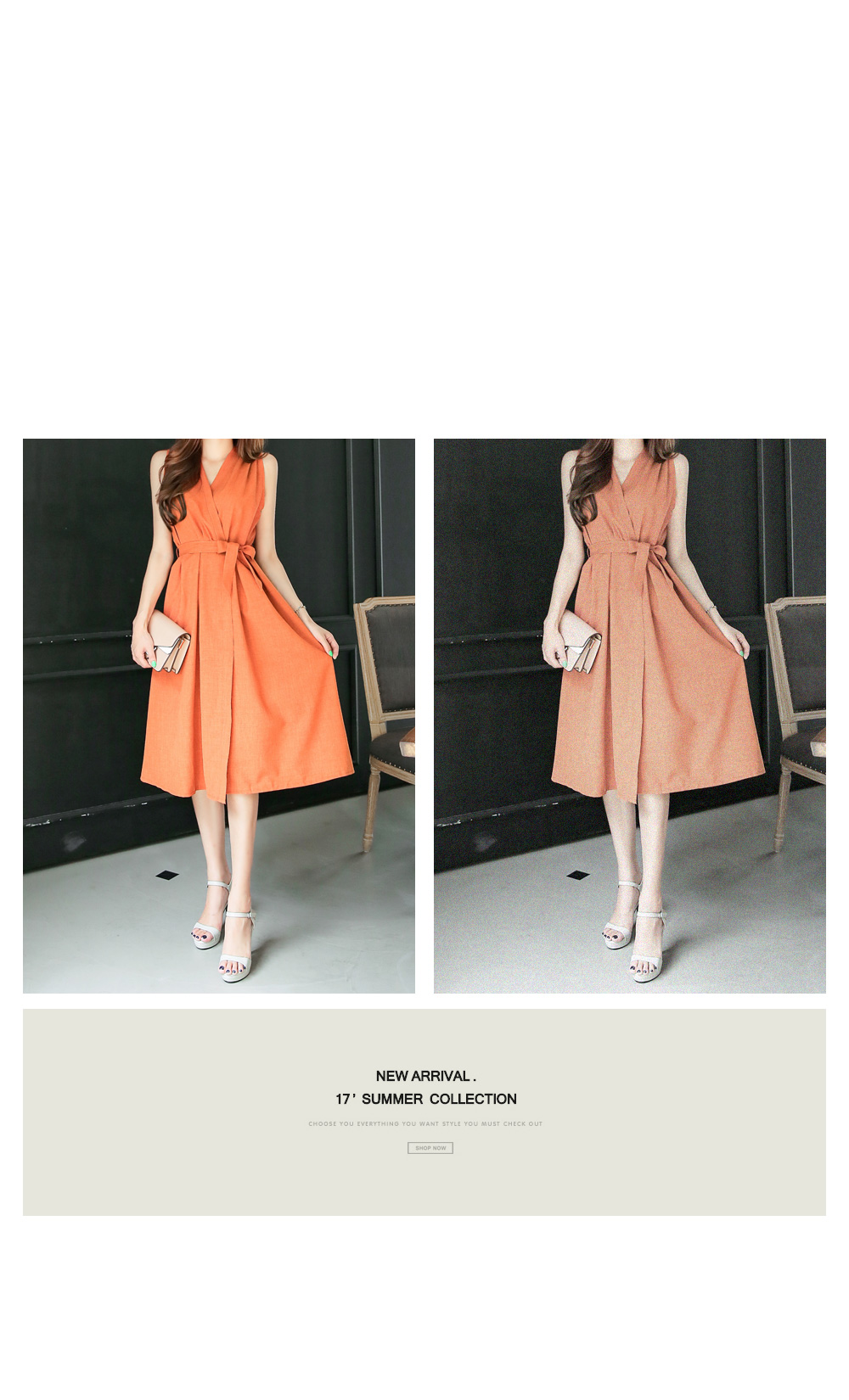 시원하고 가벼운 폴리 소재로 제작이 되어 기분 좋은 착용감과 함께 슬리브리스 디자인으로 은근히 섹시하면서 여성스러운 분위기가 연출 되요.